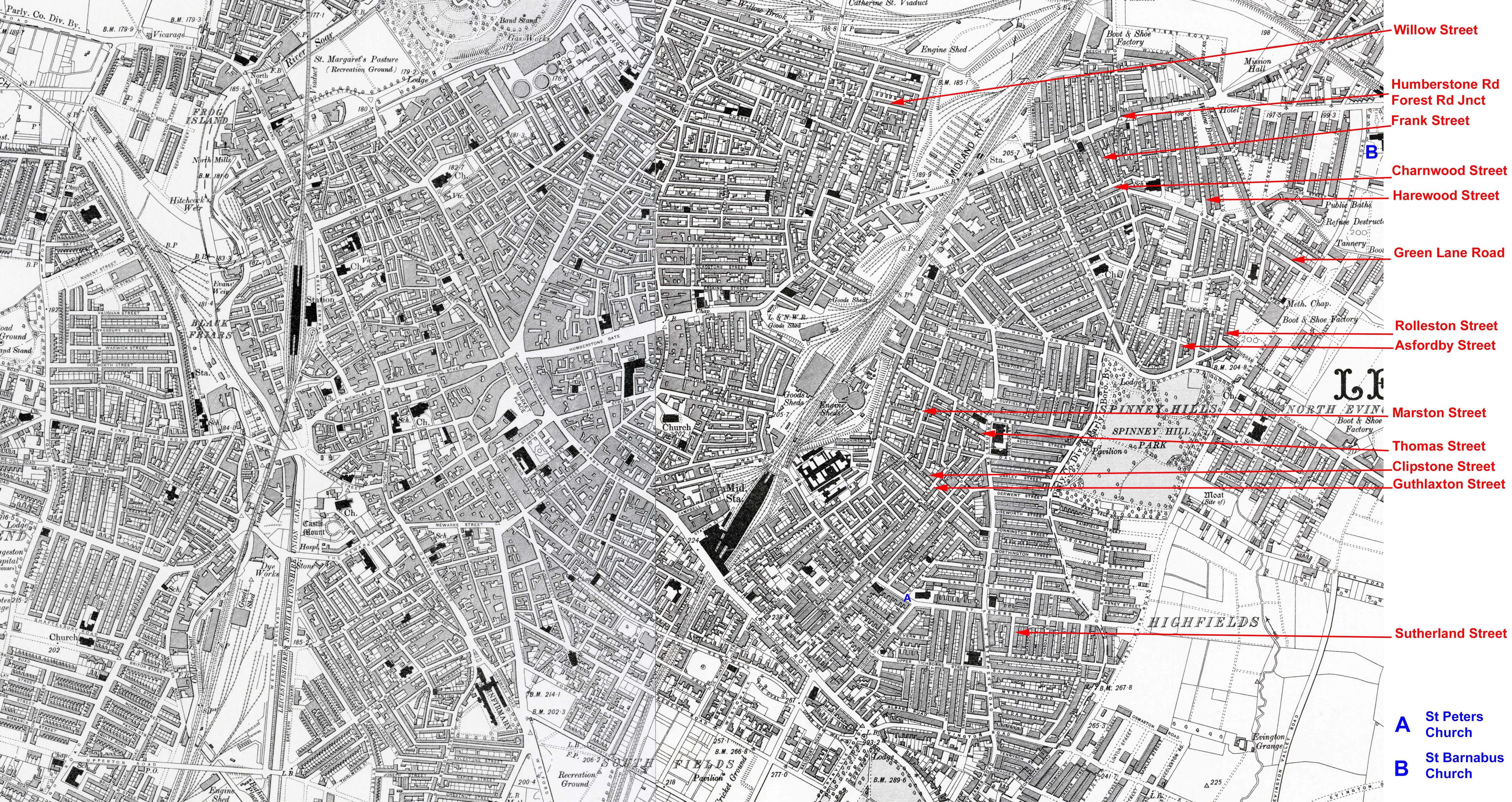 Composite map of central Leicester from Ordnance Survey Second Edition 1904: surveyed in 1884-5. Showing streets and places of interest to the Tansley family in the town mentioned in the article.