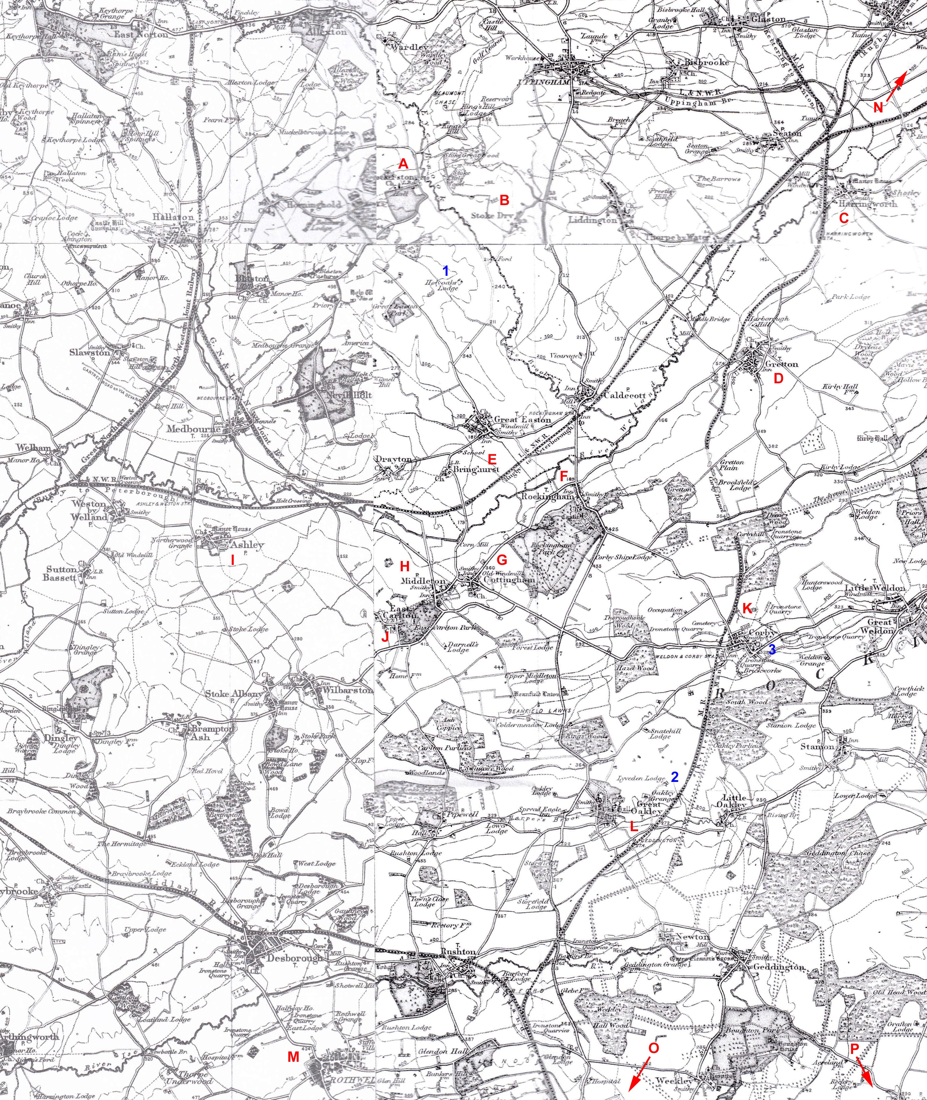 1. The Western Welland Valley: Composite detail from Small Scale (One inch to the mile) Ordnance Survey Maps of England & Wales Sheet 156: Leicester & District 1906; Sheet 157: Rutland & Stamford 1906; Sheet 170: Market Harborough & District 1905 and Sheet 171: Rockingham Forest & Kettering 1905: The Godfrey Edition